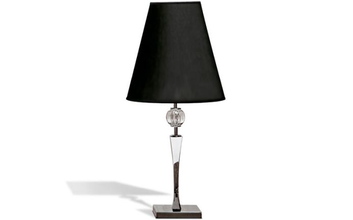 Big lamp w/chrome stainless steel base and “murano” clear blow glass ball. Black shade
