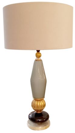 Make yourself known in your home with this Cary table lamp. A series of Murano glass and porcelain elements of various shapes stacked on top of each other forms an attractive leg of this exquisite table lamp. Each element has its own color and texture. to give this piece an exquisite sense of movement, topped with a simple drum-shaped canopy.