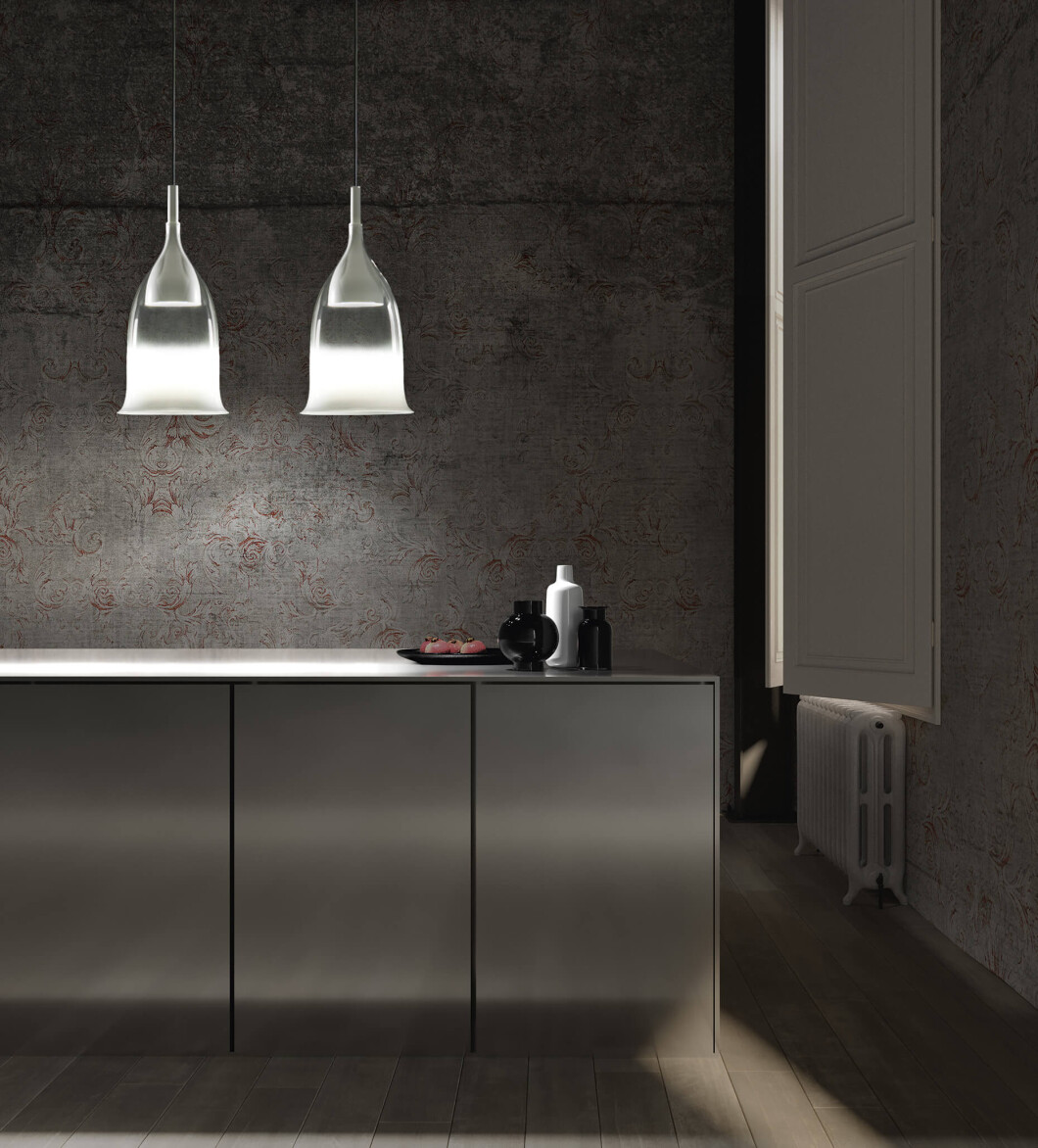 A glass pendant with a gold or white shade. Metal structure with a matte white, light gold or gray steel finish.