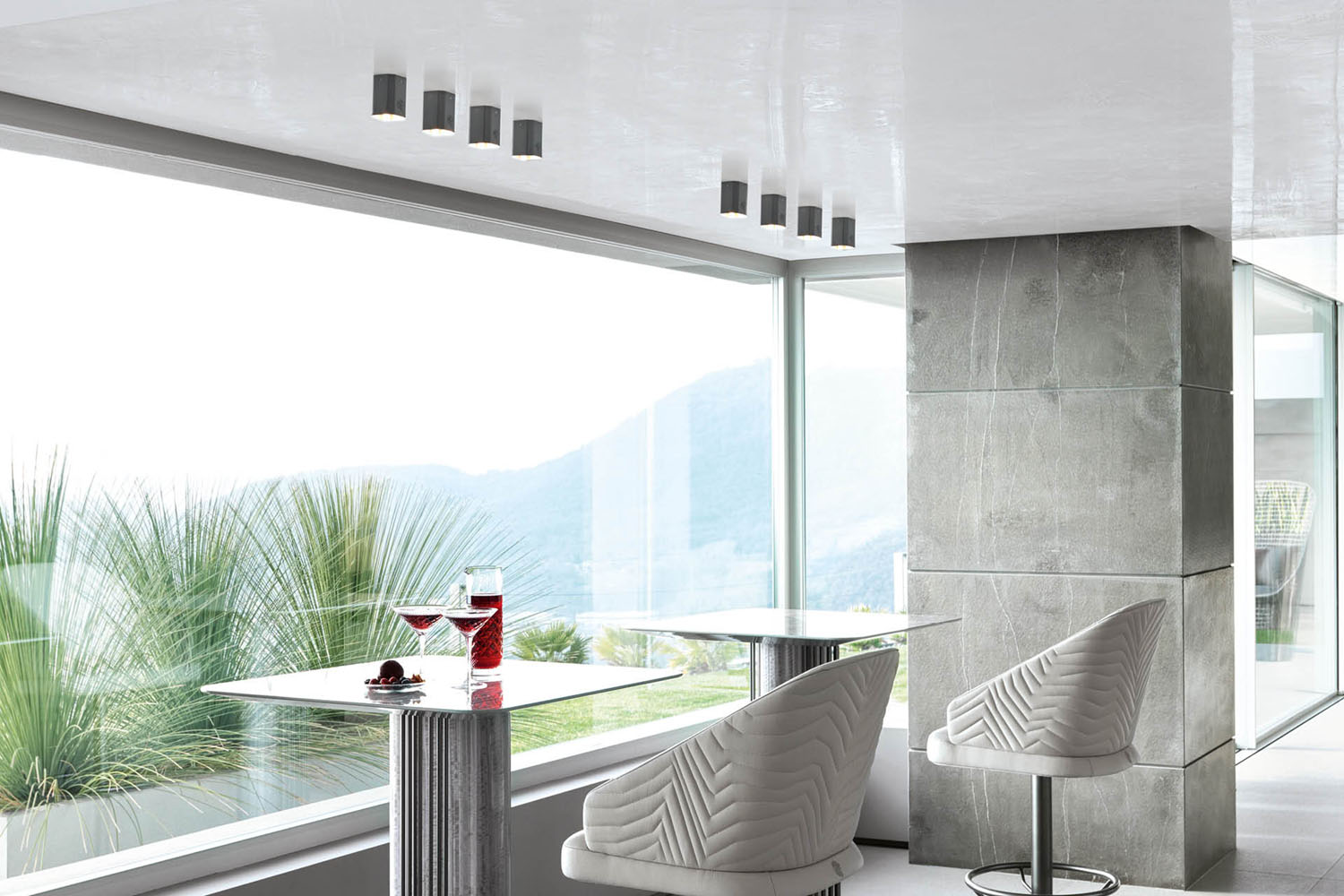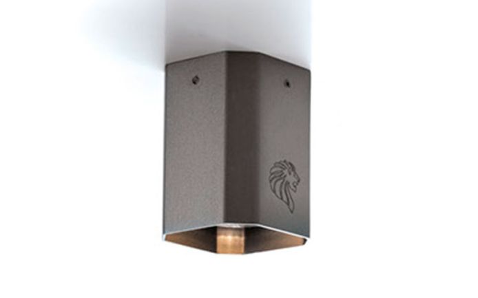 Single spotlight in satin grey nickel stainless steel with lasered Giorgio Collection logo.