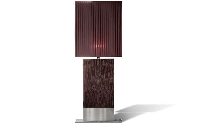 Floor lamp in high gloss polyester moka japanese tamo burl veneer with brown silk curved shade.