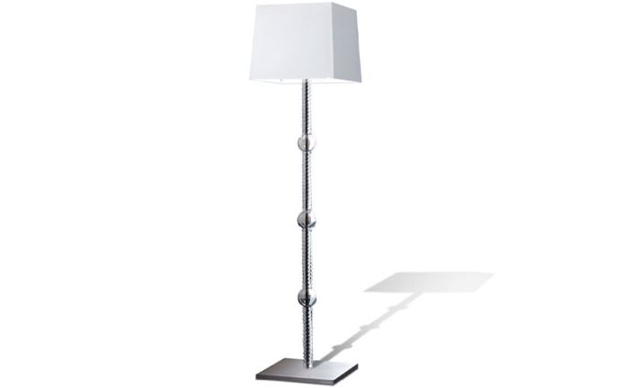 Floor lamp with base in combination of Venetian "Murano" glass and bronzed stainless steel. White satin silk shade.