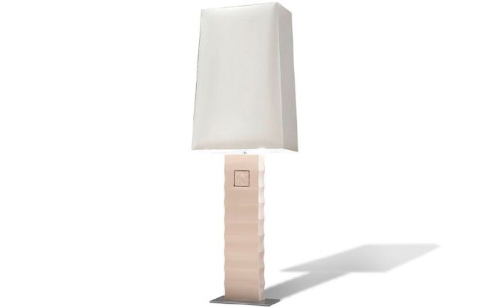 Ceramic Floor lamps in beige colour with "Giorgio collection" logo in platinum finish. Chrome stainless steel base. White satin silk shade.
