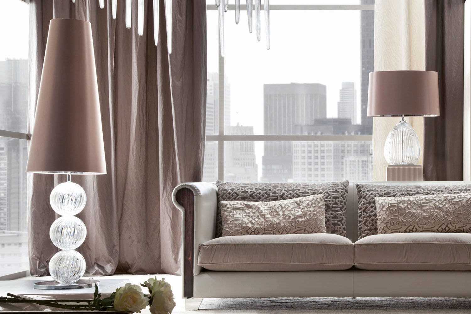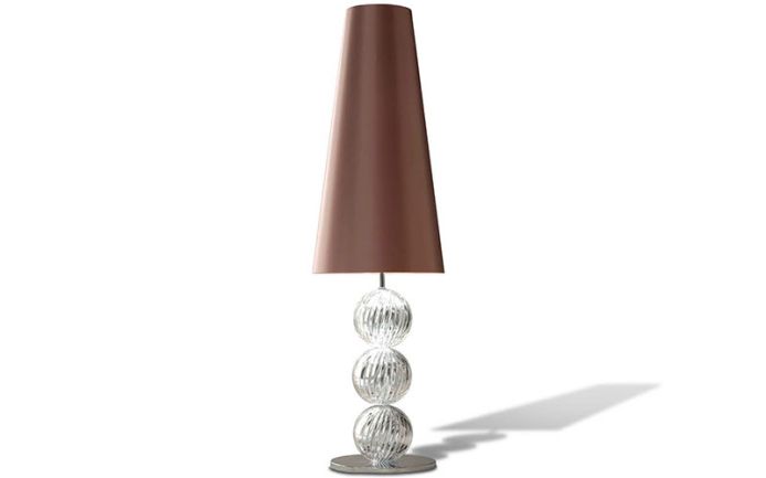 Floor lamps in combination of base in chrome stainless steel and Venetian "Murano" clear blow glass. Shade in brown satin silk.