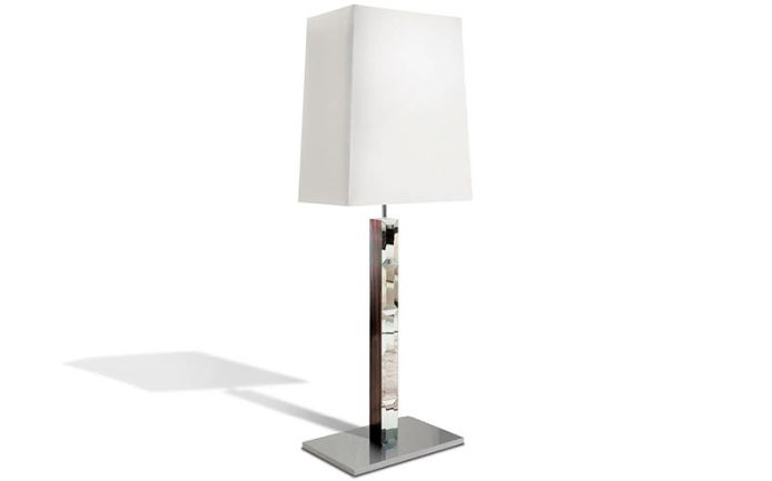 Floor lamp in combination with makassar ebony veneer in satin finish and beveled mirror. Chrome stainless steel base. White satin silk shade.