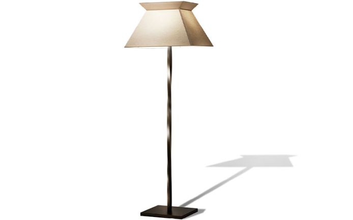 Floor lamp with base in twisted bronzed brass. Shade in cream silk.