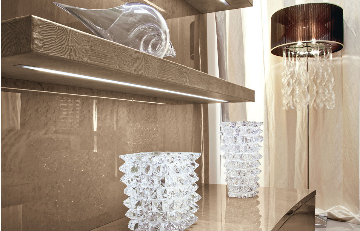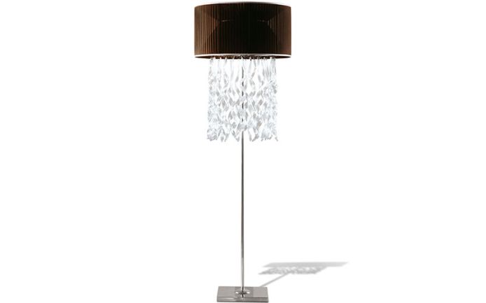 Floor lamp w/26 components of Venetian "Murano" blown glass. Chrome stainless steel base. Shade in brown silk.