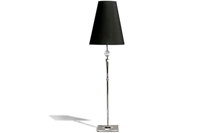 Floor lamp w/chrome stainless steel base and “murano” clear blow glass ball. Black shade.