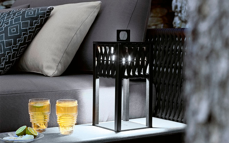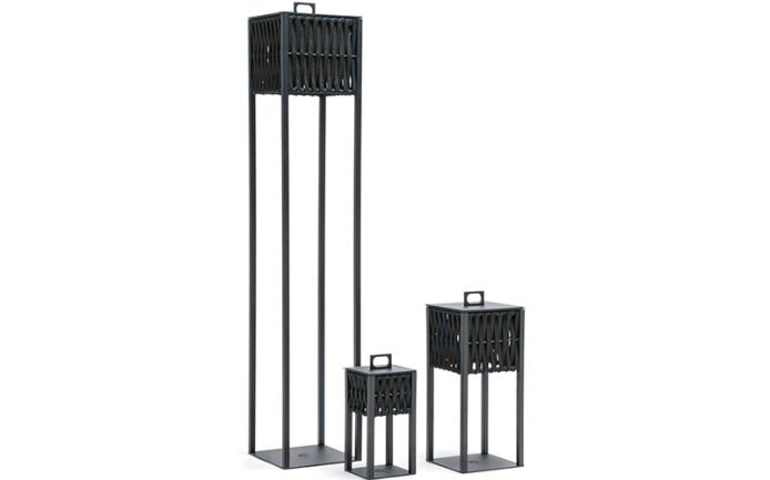 Outdoor lamps in combination of satined black metal with lasered Giorgio Collection logo and black or light grey woven cordage. Light bulb unit removable and rechargeable through usb-c port.