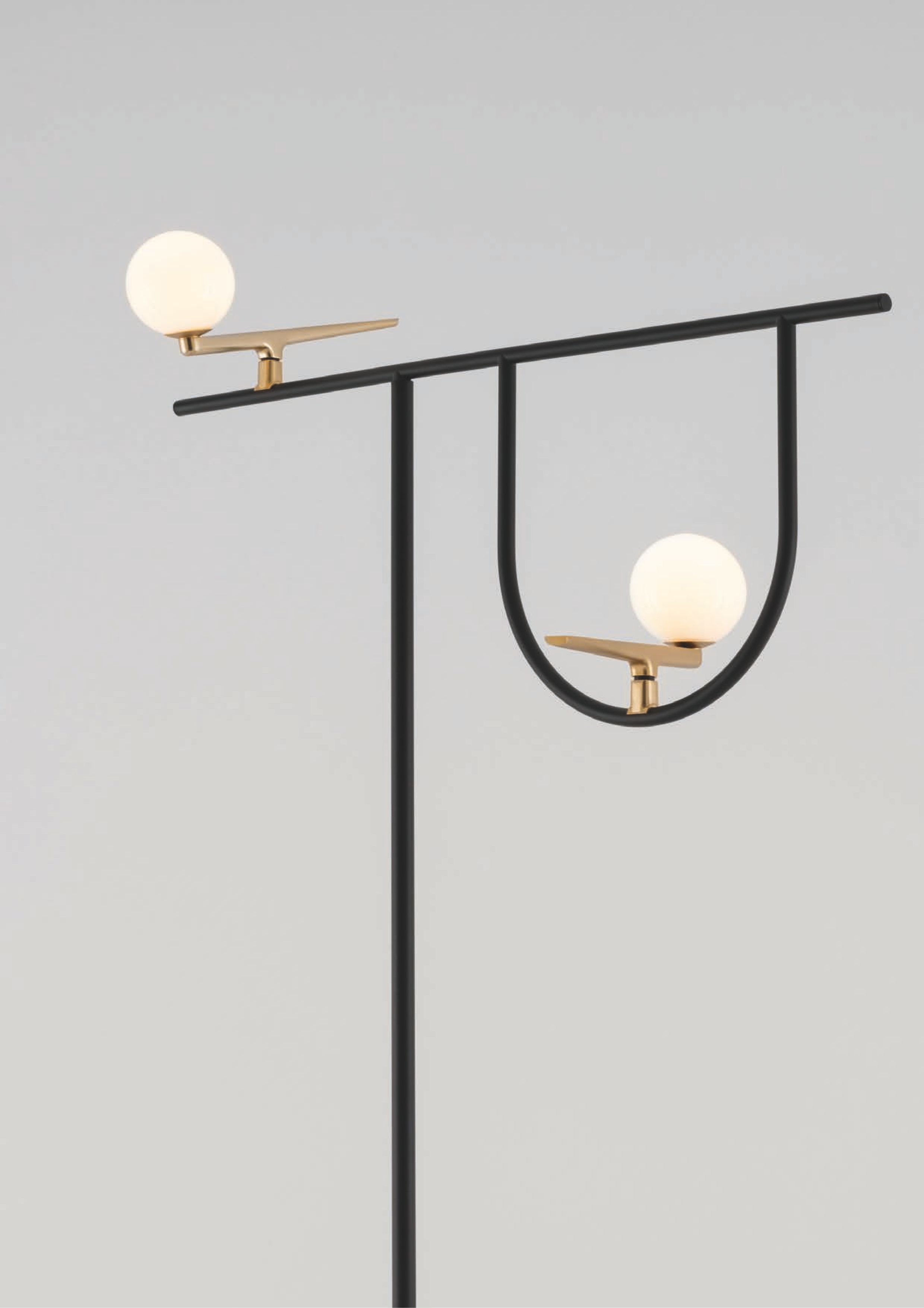 Combining tradition and innovation, Yanzi is a lightweight composition of graphic marks. Balanced structures such as branches or roosts support a variety of stylized figures to provide a variety of versions and qualities of light. These are iconic swallows with a body in brushed brass, with a head in the form of a white glass sphere encapsulating light, either flying freely or encased in glass cages. A unique sensibility in the combination of warm and cold, essential but refined materials. Yanzi is an open system, ideal for creating light compositions and light landscapes that enliven any space with an elegant poetic stance.
