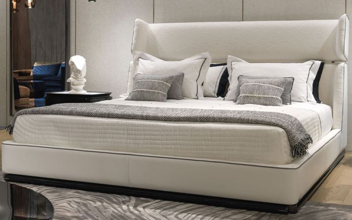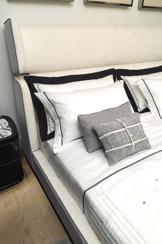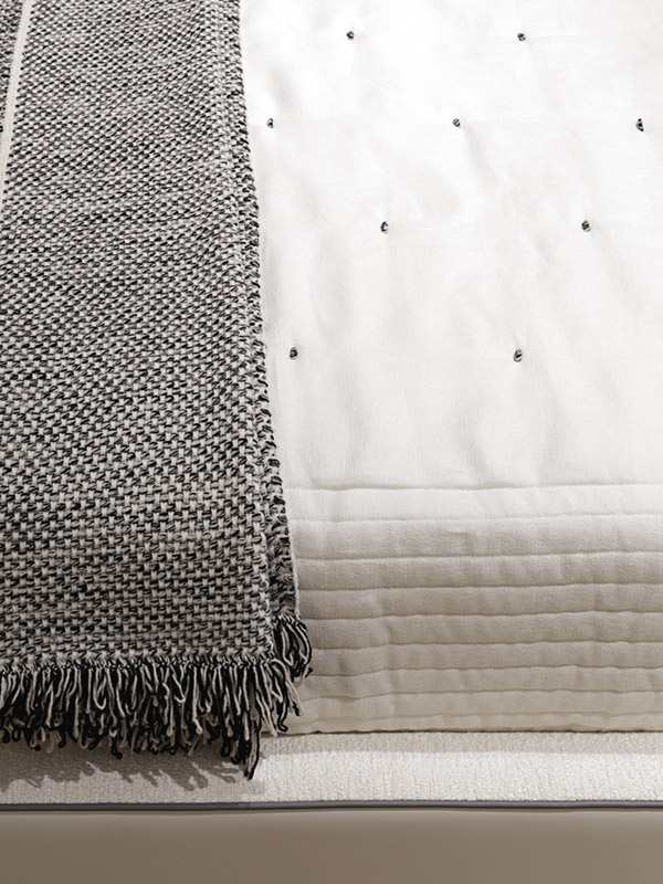 Natural white 100% cotton satin sheets with black decorative piping on the top sheet. Pillowcases with ruffles on 4 sides and black decorative piping. Bedcover in 100% natural white linen with offset diamond-shaped quilting. Application of Black-White knots. 100% pure cotton solid color lining.