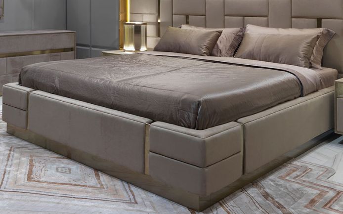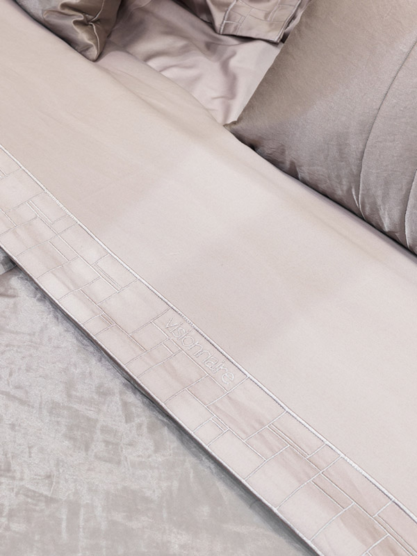 100% cotton satin sheet in taupe color. Embroidered square design on the edge of the top sheet and on the two ruffles of the pillowcases. Visionnaire logo embroidered on the edge of the sheet. Bedcover with right angles and square quilting on a "beloved" design, in 100% polyester satin with added metal thread, Taupe color. Matching 100% cotton lining.
