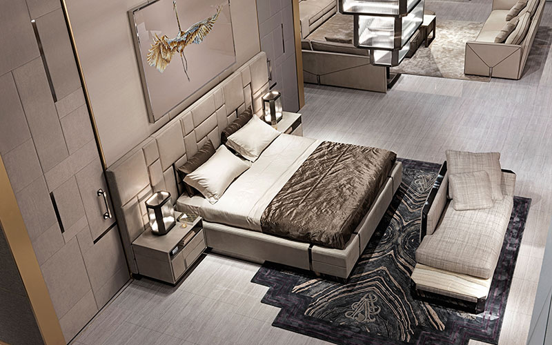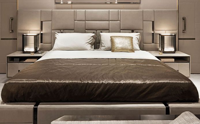 Sand colored 100% cotton satin sheets. Embroidered square design on the edge of the top sheet and on the two ruffles of the pillowcases. Visionnaire logo embroidered on the edge of the sheet. Bedcover with right angles and rectangular quilting on a "beloved" design, in 100% polyester satin with added metallic thread, Chestnut Brown color. Matching 100% cotton lining.