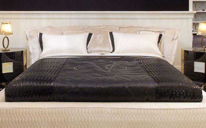 Ivory-coloured 100% cotton satin sheet. Sheet border on top sheet and on both sides of pillowcases in black satin. Embroidered "V" logo on top sheet in black. Black satin bed cover with straight corners, macro "V" logo quilted in the centre with Swarovsky crystal appliqué. Central part and side bands in black micro-paillettes.