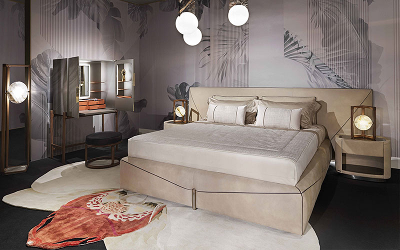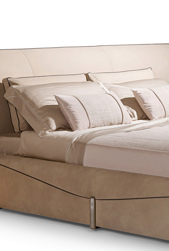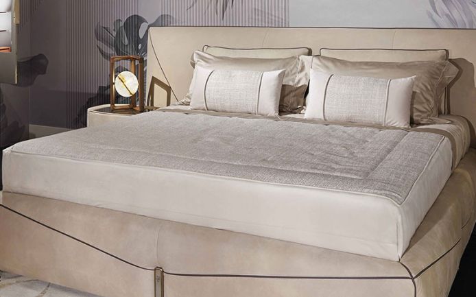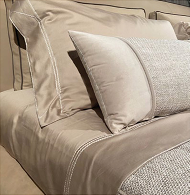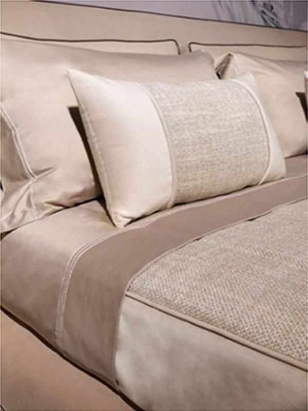100% cotton satin bed sheet in biscuit color. Top sheet border and two pillowcase ruffles embroidered with chunky yarn appliqué of the patterned bedspread fabric, Visionnaire logo on top sheet, tone on tone. Bed cover with right angles, quilting dashes positioned in diamond pattern, perimeter border. central part in Papyrus Natural coarse thread fabric, sand color, outlined in velvet, on the 3 sides padded edges in beige/sand color velvet. Solid-coloured 100% cotton lining.
