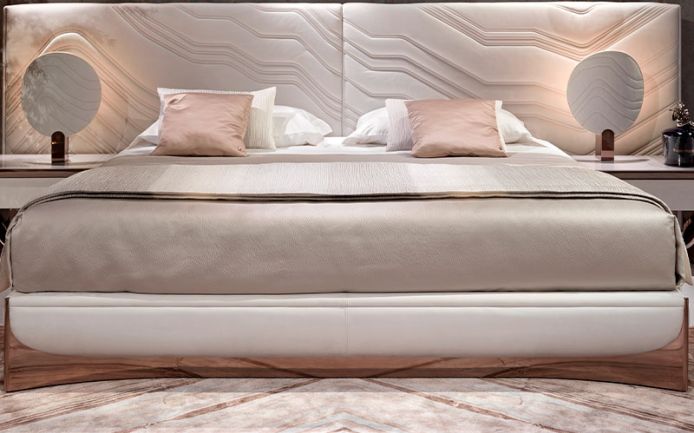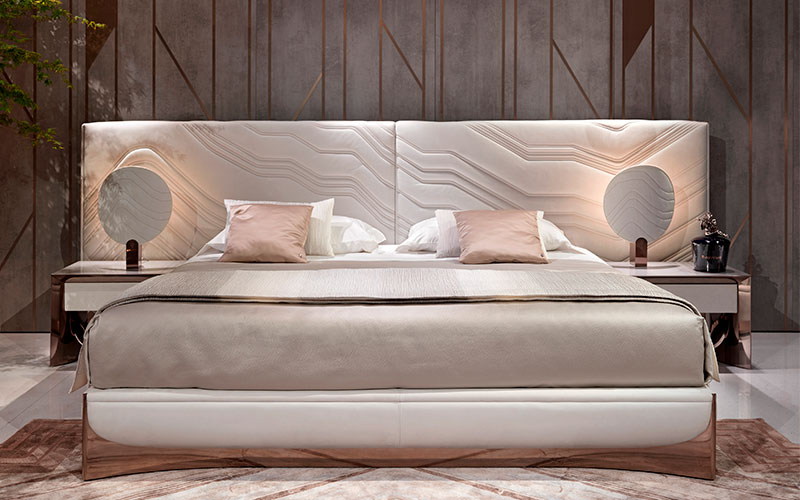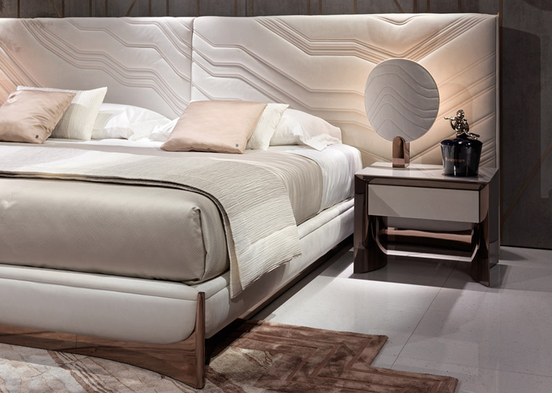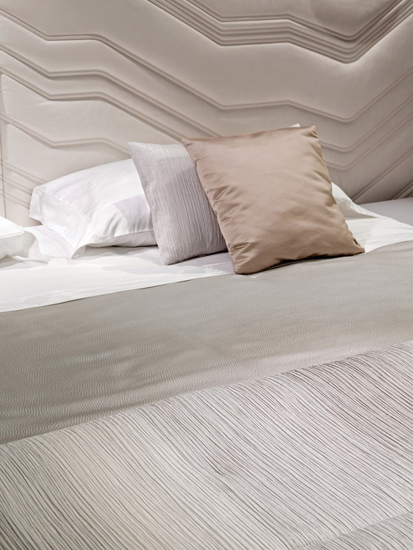 100% cotton satin sheets in natural white. Ca' Foscari embroidery on the edge of the top sheet and on the two ruffles of the pillowcases. Visionnaire logo embroidered on the edge of the sheet, tone on tone. Bed cover with right angles, quilting with diamond staggered dashes on the perimeter edge. 100% polyester satin with hammered relief effect, pearl gray Oyster color. Matching 100% pure cotton lining. Second bed cover in double-face pleated effect fabric, Jacquard workmanship, printed in Gray color gradient from natural white to pearl gray.