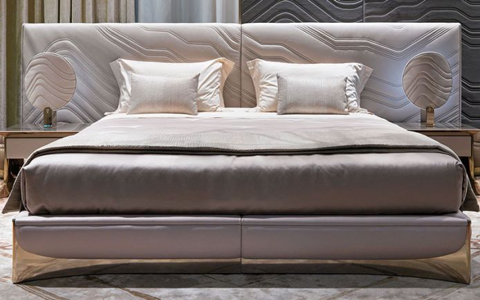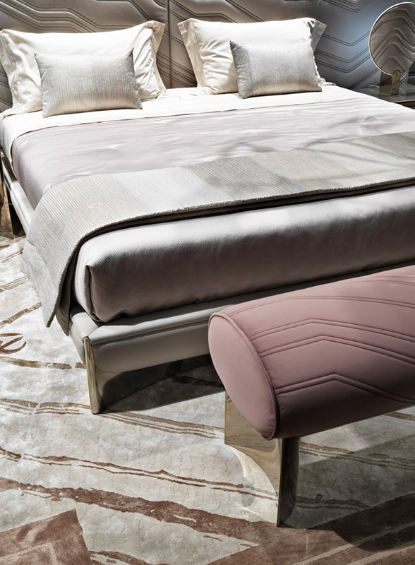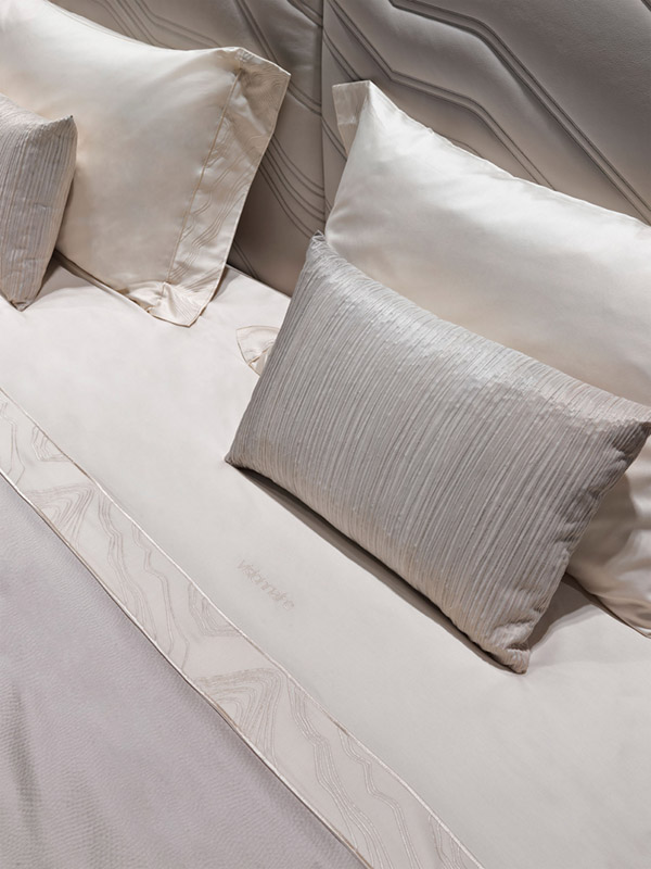 100% cotton satin sheets in rosy beige color. Ca' Foscari embroidery on the edge of the top sheet and on the two ruffles of the pillowcases. Visionnaire logo embroidered on the edge of the sheet, tone on tone. Bedcover with right angles, quilting with diamond staggered dashes, perimeter edge. In 100% polyester satin with hammered relief effect, blush color. Matching 100% pure cotton lining. Blanket in double-face pleated effect fabric, Jacquard workmanship, printed in a Moka color shade from beige to dove gray.