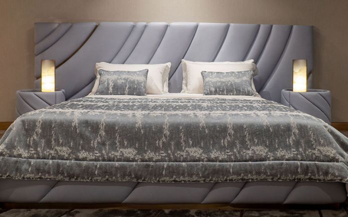 100% cotton satin sheets in ice grey. Ultrasound embroidery on top sheet border and on the two pillowcase ruffles tone-on-tone with silver thread insert. Visionnaire logo embroidered on sheet edge.White velvet bed cover with rounded corners, perimeter border and wave-effect quilting. Matching pure cotton lining. Double-sided bed base in mint/white/white damask effect fabric.