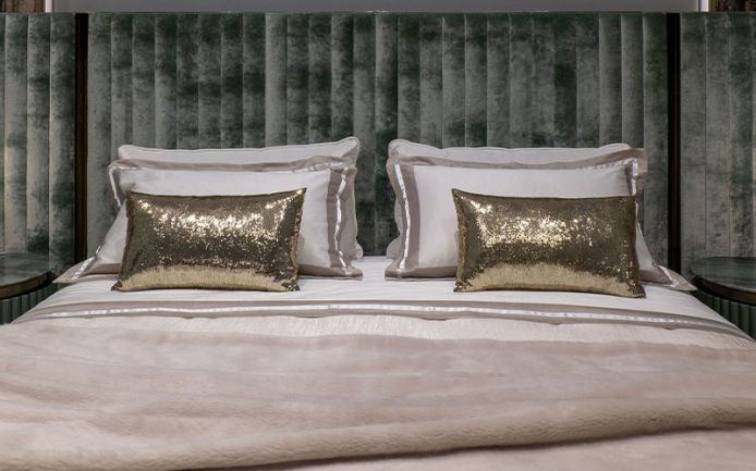100% natural white cotton satin sheet. Top sheet with sand-coloured border and contrasting satin ribbon application in natural color. Tone-on-tone embroidered Visionnaire logo. Pillowcase with 4 flounces in sand color and contrasting natural color satin ribbon applied. Bed cover in natural-coloured white faux plain fabric with horizontal stripes, right angles, diamond-patterned quilting, perimeter border. Matching pure cotton lining. Double-sided bed base, one side in white shiny velvet and one side in 90 milk-coloured Vellus faux fur.
