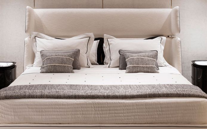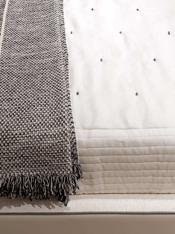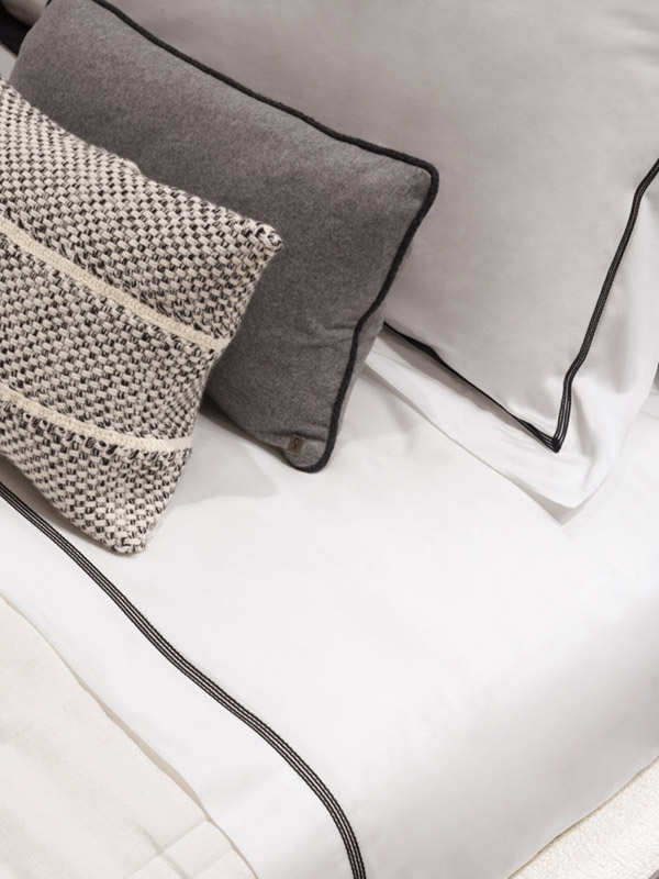 Set of sheets with 2 pillow cases cm 80x50, set of 2 additional pillow cases cm 80x50, bedcover cm 290x246 in flax, plaid in wool cm 150x230 with short fringe.