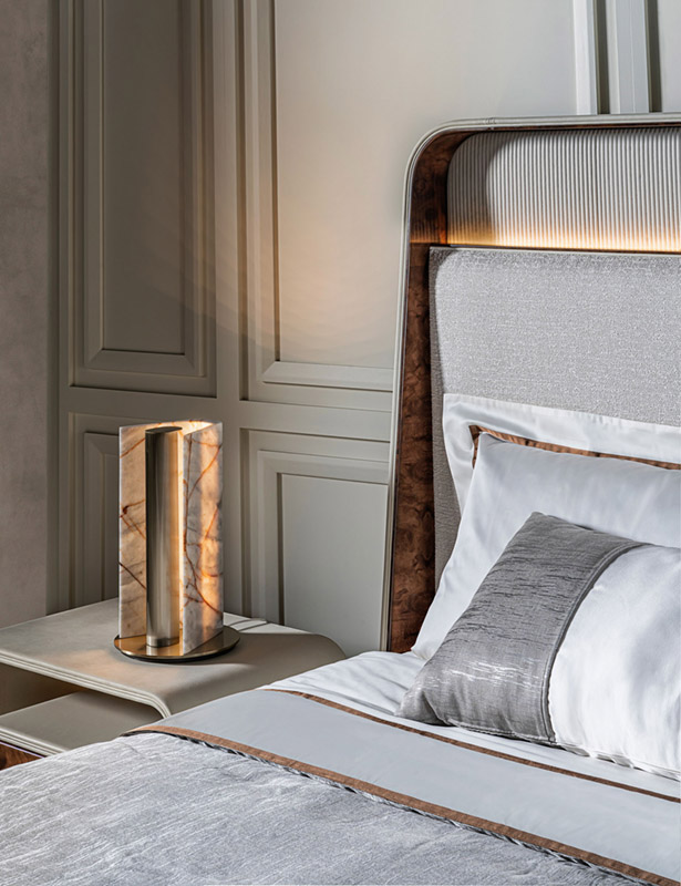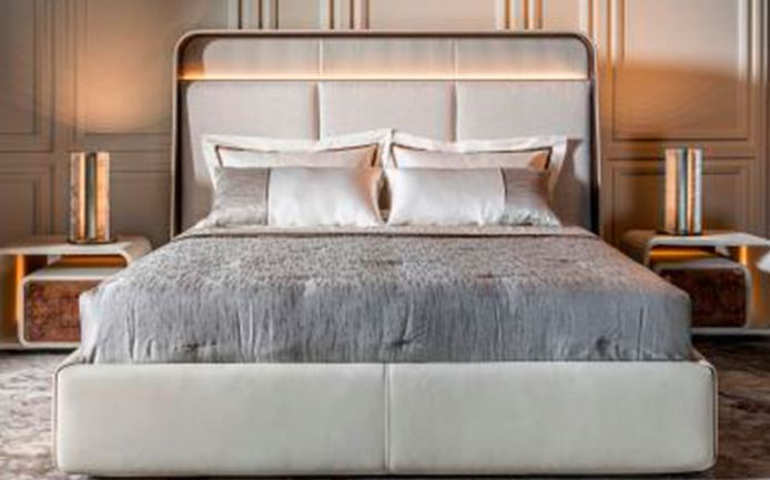 Natural white 100% cotton satin sheets. Top sheet with application of brown satin ribbon. Visionnaire logo embroidered on the tone-on-tone edge of the sheet. Pillowcases with 4 ruffles framed by brown satin ribbon. Bedcover in faux uni color hazelnut color fabric with horizontal stripes, with right angles, diamond-shaped staggered dashes quilting, perimeter edge. Pure cotton lining in the same color. Knitted plaid in raw color 100% pure cashmere.