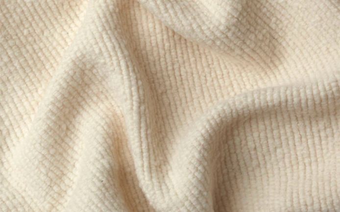 A wool, silk and cashmere blanket made with a particular bouclè weave, which gives it a wavy and elaborate appearance. The silk fibre lends a subtle sheen, while the cashmere guarantees softness.
