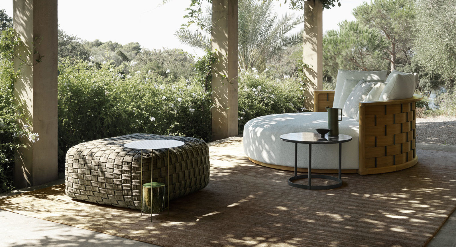 100% PET carpet is able to transmit the natural shine of silk. The drawing resembles the shadows cast by the leaves of palm trees and their natural geometry. Ideal for both indoor and outdoor use, Palma embodies responsibility and environmental friendliness towards nature.