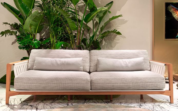 Structure in solid iroko wood assembled by interlocking and polyurethane glue, steel staples and zip in stainless steel. Seat frame in birch multiply wood with border covered with greased calf leather.