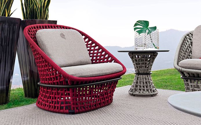 Outdoor occasional chair in special treated fabric or first grade leather. Cushion filling in waterproof dacron. Structure in combination of satined black metal treated in cataphoresis with inserted Giorgio Collection logo and woven cordage.