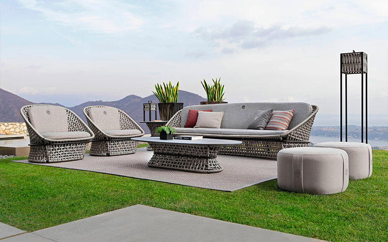 Outdoor occasional chair in special treated fabric or first grade leather. Cushion filling in waterproof dacron. Structure in combination of satined black metal treated in cataphoresis with inserted Giorgio Collection logo and woven cordage.