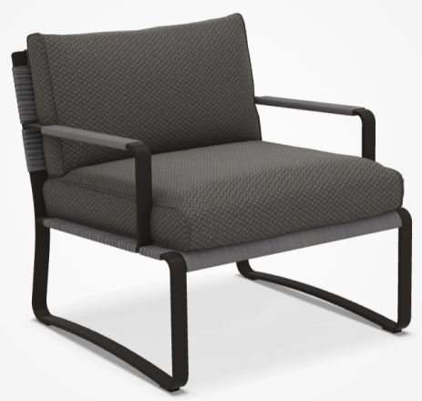 The construction of polished painted aluminum, which creates a bend in the crossbar of the seat to soften the edge, is emphasized by the upholstery made of polypropylene ropes. This is a dense weave, made entirely by hand, with a motif reminiscent of the Mediterranean tradition of making baskets and trays, which "warms" the minimalism of the design.