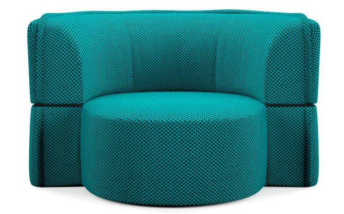 An armchair with a soft and enveloping design, which alternatively becomes a large island that can be experienced in freedom by simply tipping over the reclining backrest in one movement that resembles the "blink of an eye".
