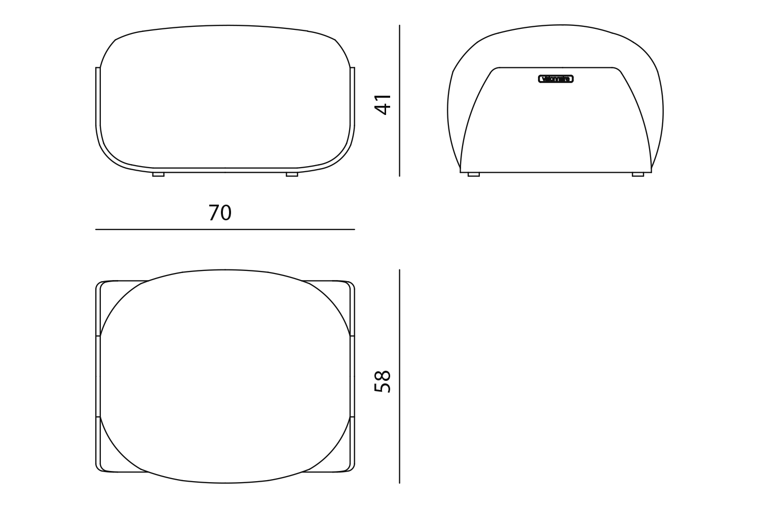 Outdoor pouffe, base structure in curved marine plywood covered with teak containing a seat cushion in polyurethane foam in different densities, upholstered in fabric or leather for outdoor use.
