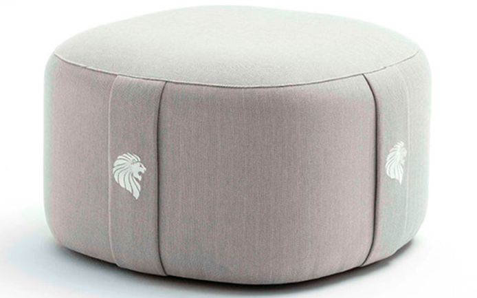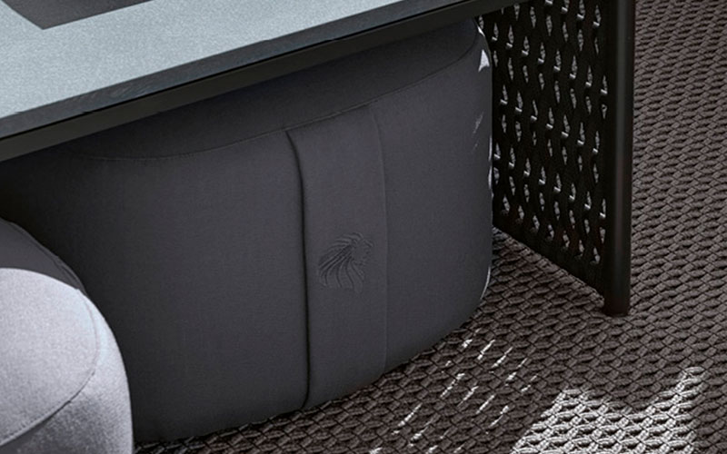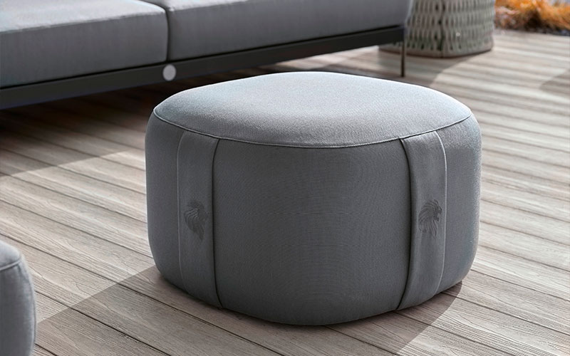 Outdoor round ottoman available in special treated fabric or first grade leather. 4 Giorgio collection logos embroidered on the sides.