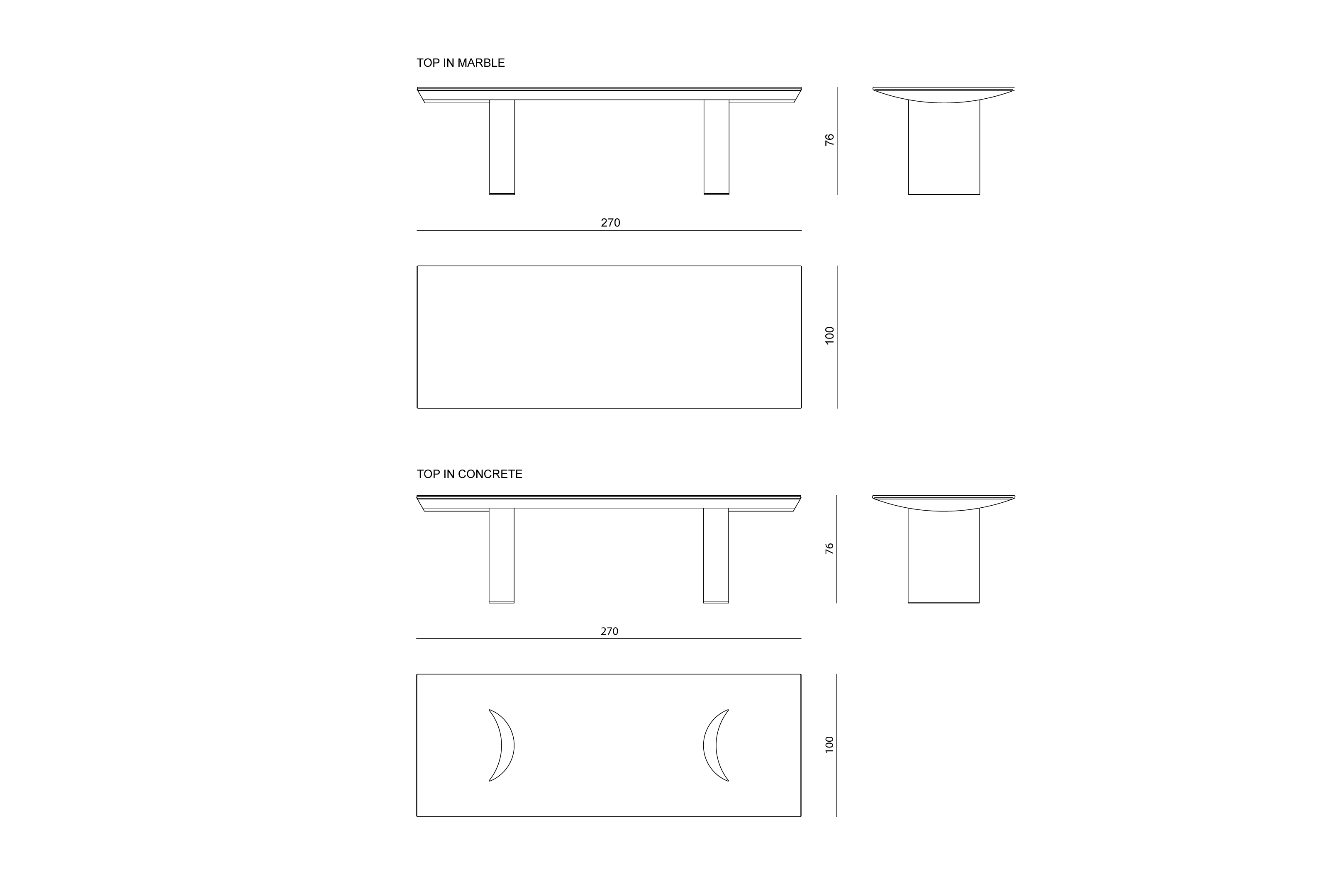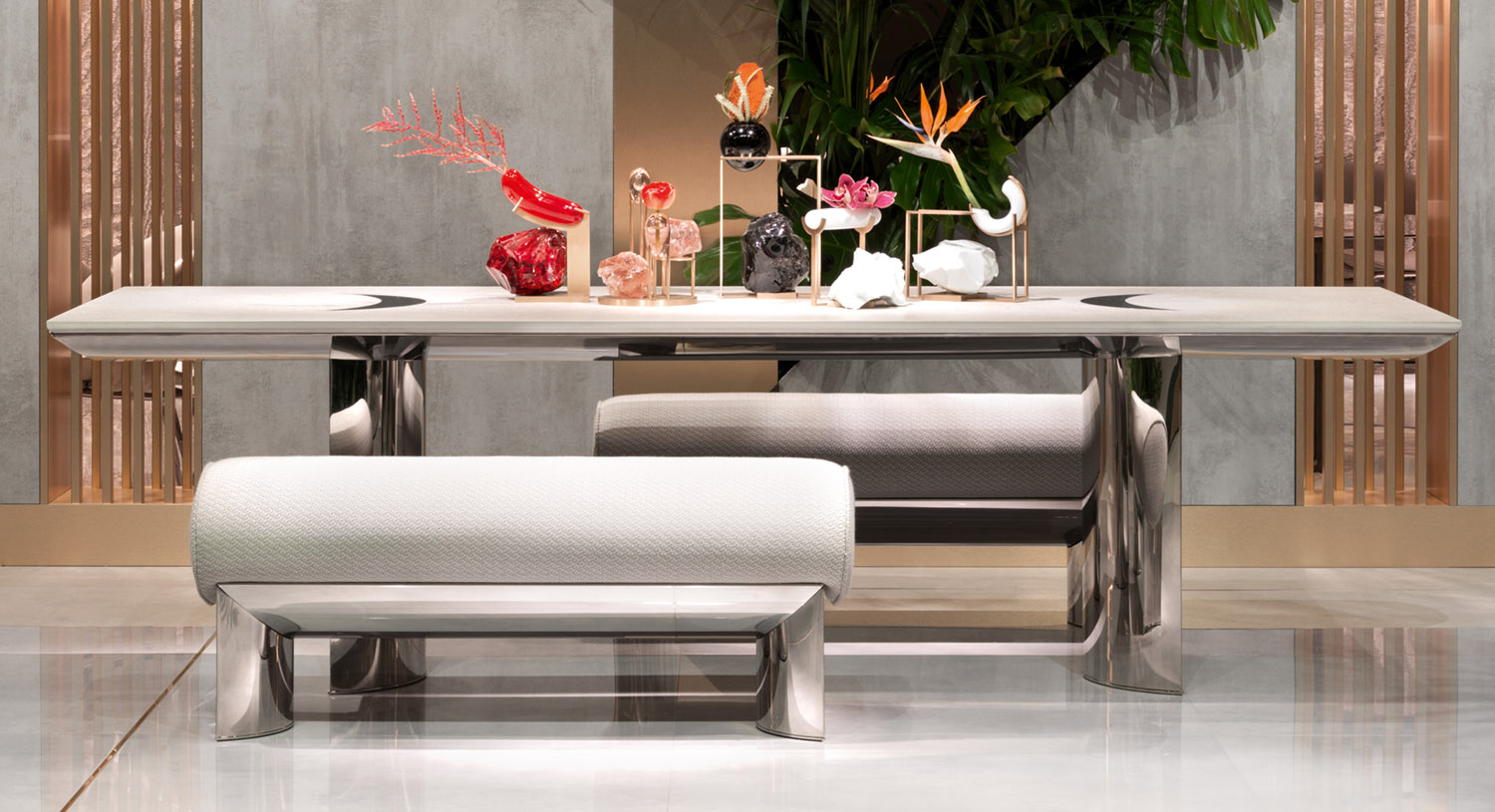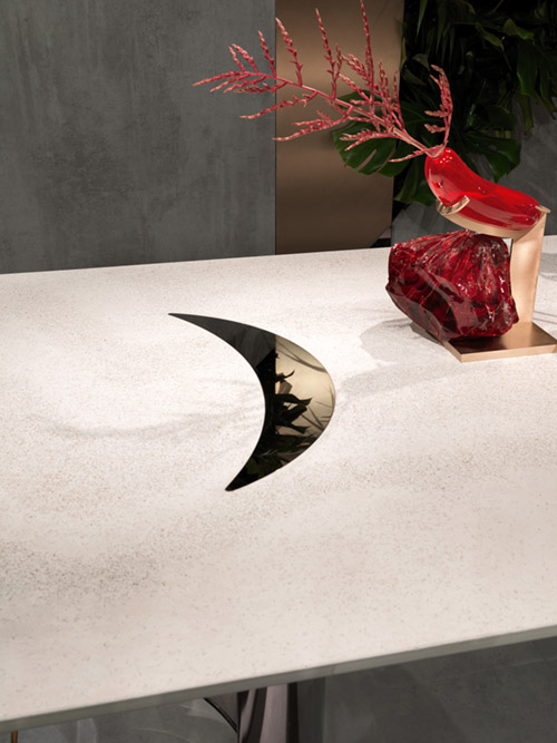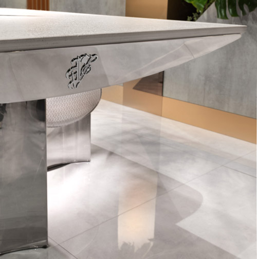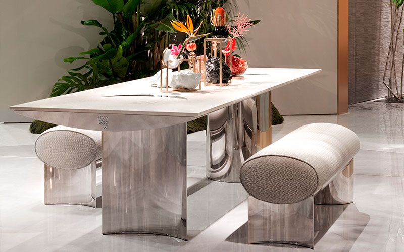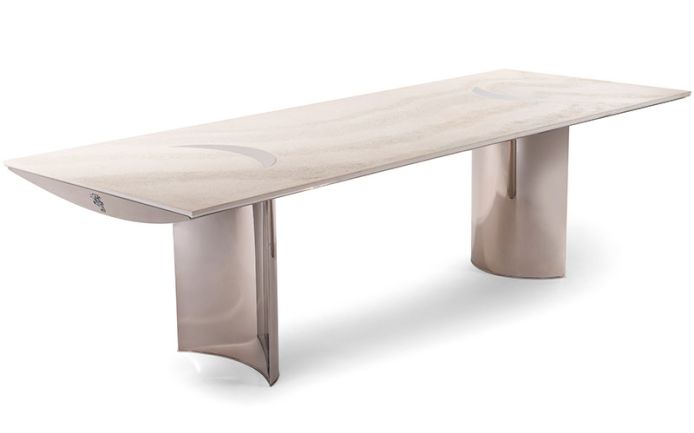 Outdoor dining table. Main structure in polished 316 stainless steel with curved under-top and column-shaped legs designing concave and convex angles.
