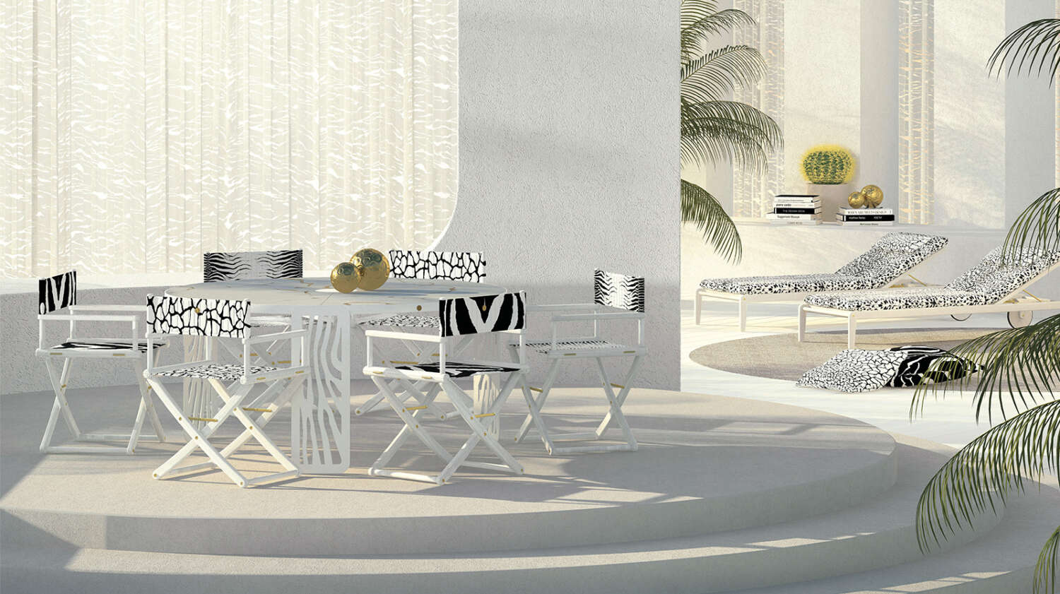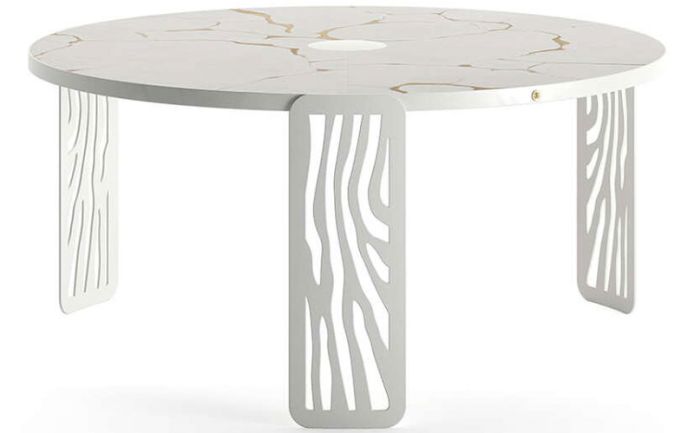 Natural inspiration and African references for a scenographic and sculptural table. The base of this decorative piece of furniture is made of calendered iron with a laser-cut pattern that recalls both the iconic animal motifs and the desert dunes evoked by the name.