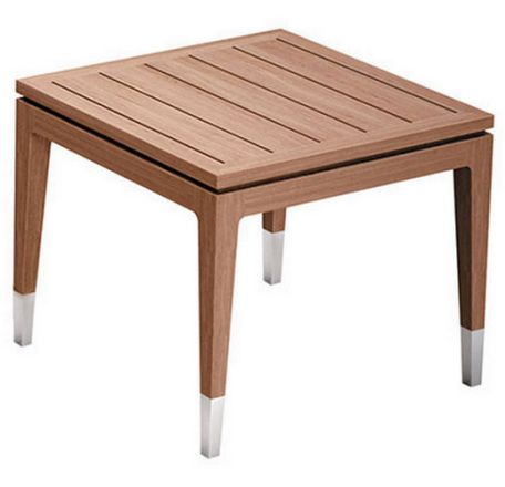 Square teak table with polished steel details. The perfect combination of wood and metal gives the Algero a distinct personality, ideal for any luxurious interior.