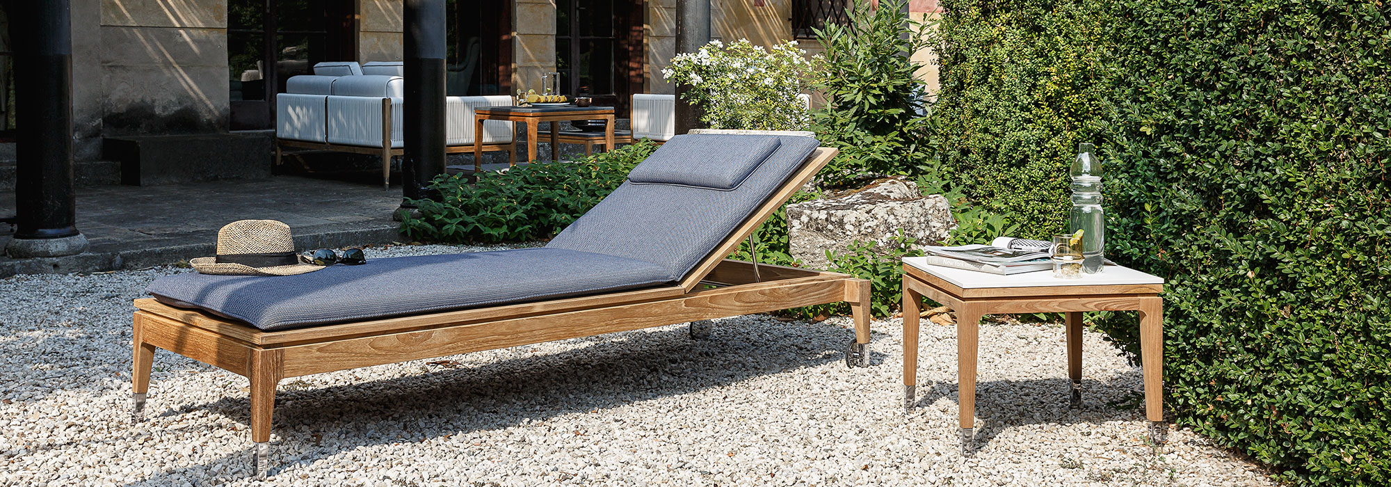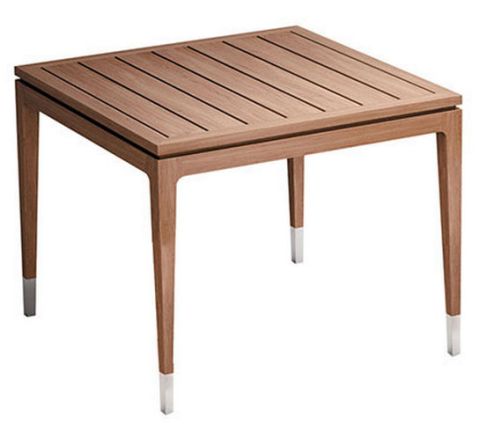 Square teak table with polished steel details. The perfect combination of wood and metal gives the Algero a distinct personality, ideal for any luxurious interior.