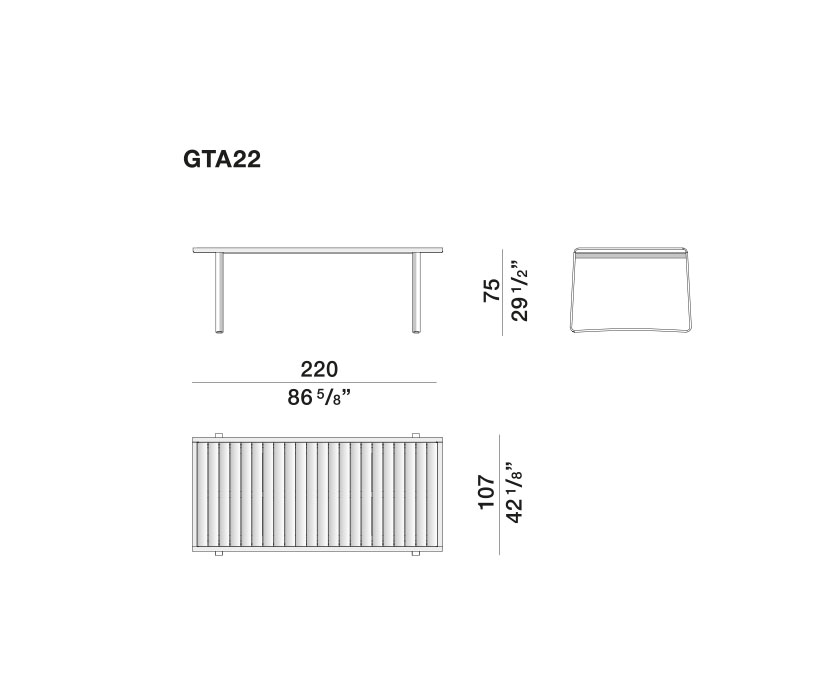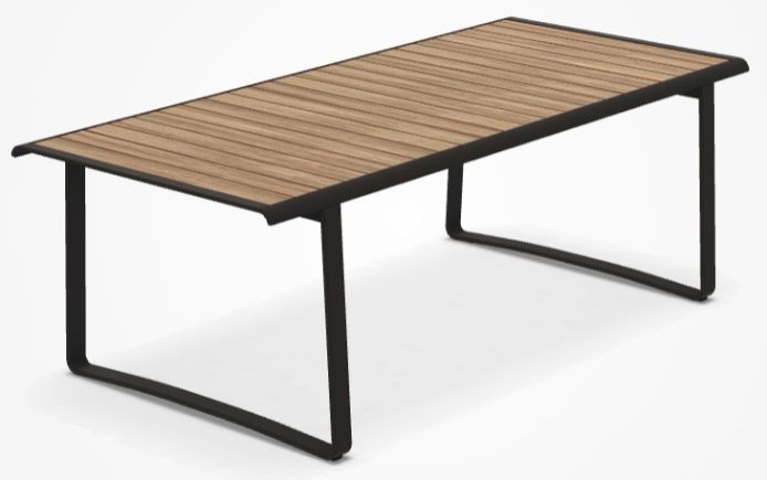 The Golden gate dining table interprets the archetype of outdoor tables with a lattice top for water drainage. Designed for 6 or 8 people, it is distinguished by carefully adjusted proportions and a choice of materials. The table top is available in two versions: from solid teak wood slats or from lava stone slabs.
