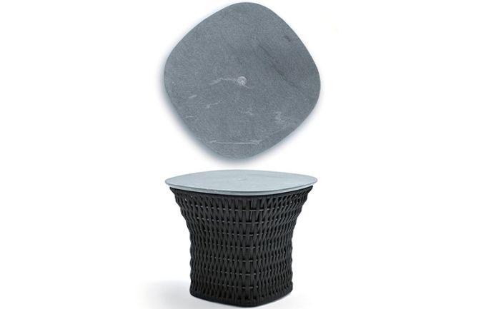 Outdoor side table in combination of satined black metal and black or light grey woven cordage. Top made by slats of treated “CARDOSO” natural stone with inserted Giorgio Collection logo.