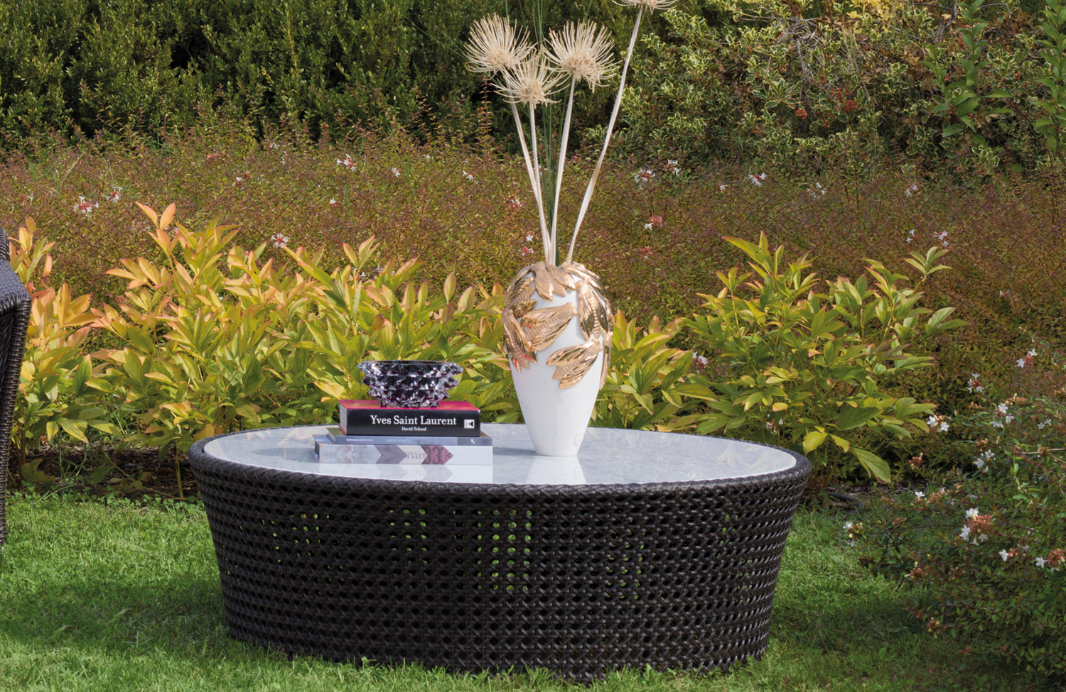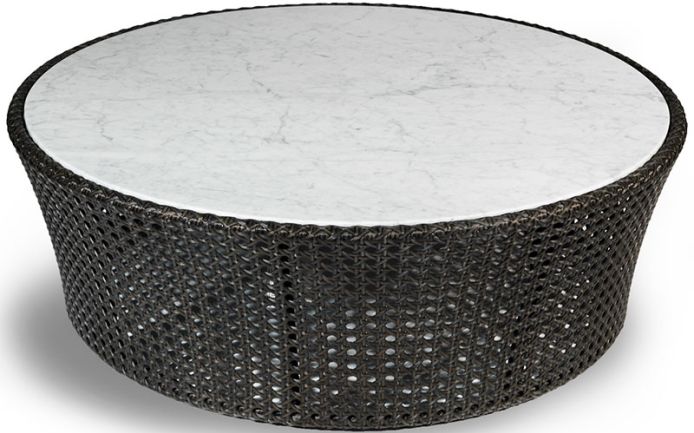 Round low table in hand-woven synthetic rattan, giving a “Vienna straw” pattern effect, frame in aluminium truss. Top in marble. Synthetic rattan is available in white gold, honey gold and bronze.
