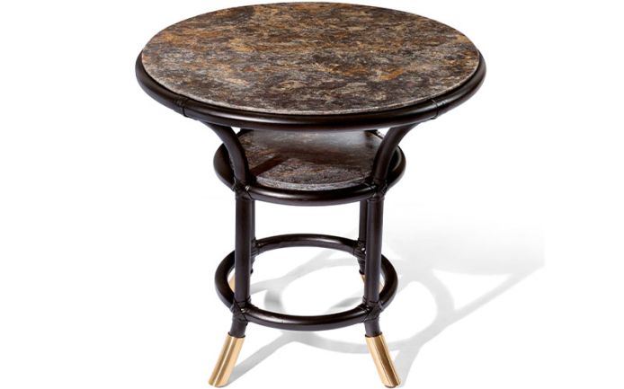Main structure made in natural wicker, belts in leather. Upper and lower top in granite. Decorative tubular metal elements can be lacquered in any colour of the metal finish selection.