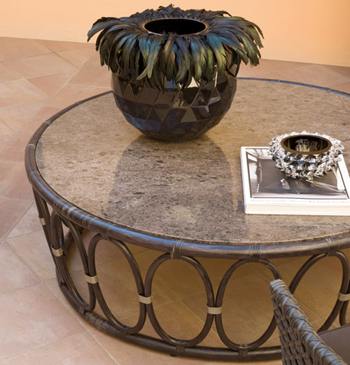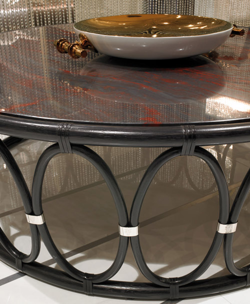Main structure made in stripped and lacquered manao wood with bindings in cuoio leather and metal clips in shiny stainless steel with Visionnaire engraved coat of arms. Top in marble or in back-lacquered glass.
