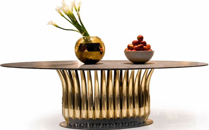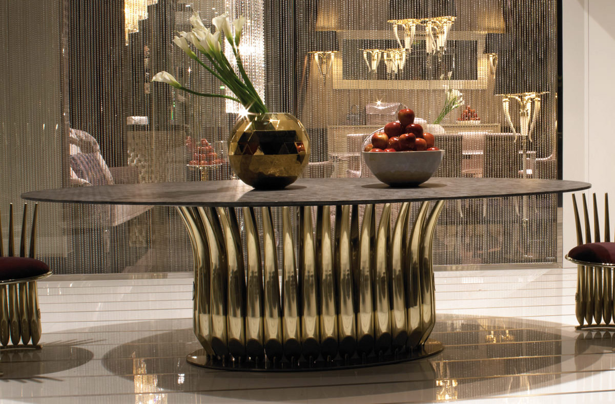 Main structure made of curved cone chromed steel with crown connecting in aluminium. Vase in shiny enamelled finishing with golden Visionnaire coat of arms.
