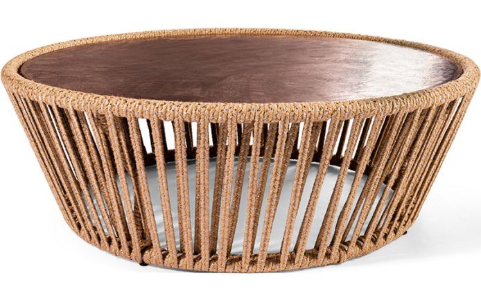Outdoor low table, frame in lacquered and galvanised metal interwoven with hempen rope and lurex threads. Top in enamelled lava stone, anthracite colour.