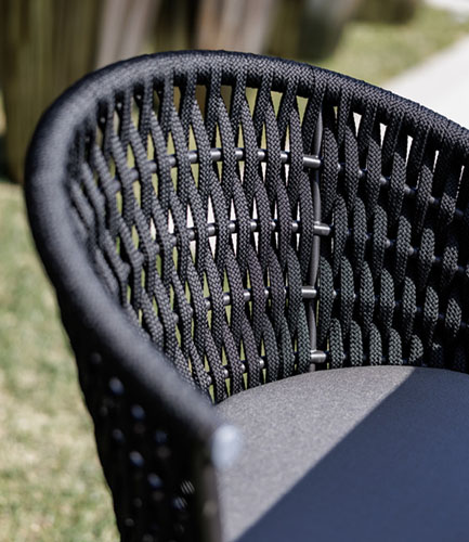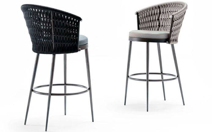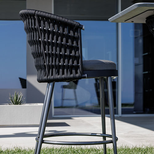 Outdoor bar chair with legs and structure in satined black metal. Back seat in light grey or black woven cordage.