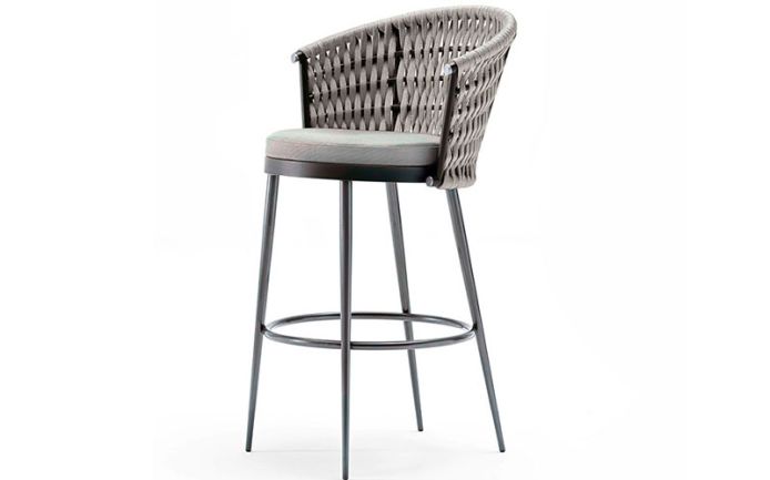Outdoor bar chair with legs and structure in satined black metal. Back seat in light grey or black woven cordage.