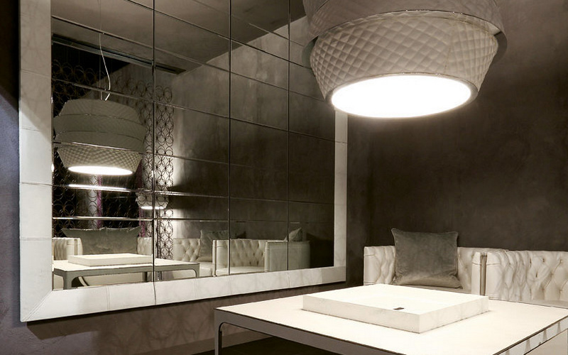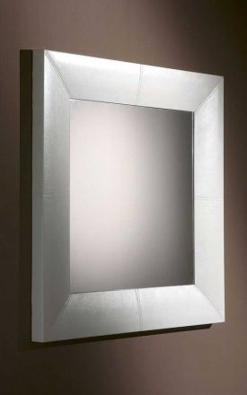 The Bucarest mirror is decorated with a simple wide frame trimmed with leather. It can have different sizes. The floor version of such a mirror is attached to the wall and held on a low stand.