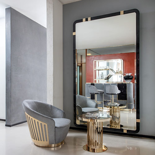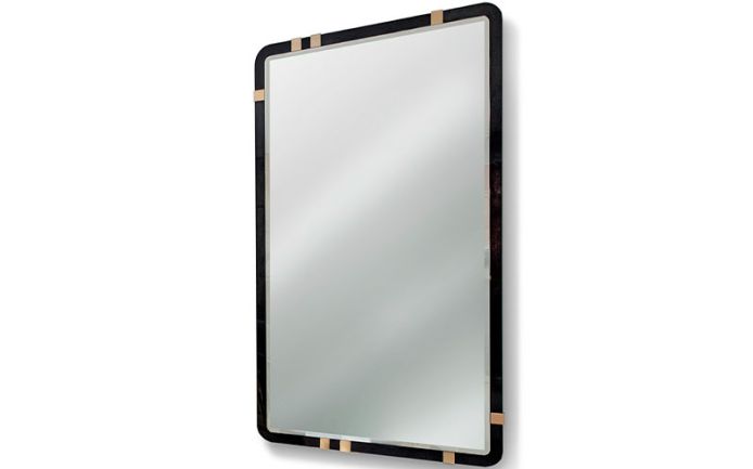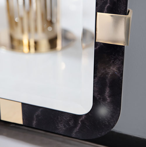 Floor rectangular mirror with beveled glass. Frames in combination of Black Bubinga burl veneer with high gloss polyester finish and light gold chrome stainless steel.