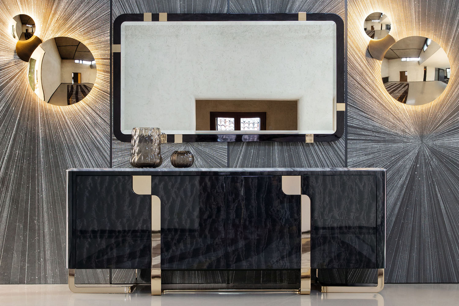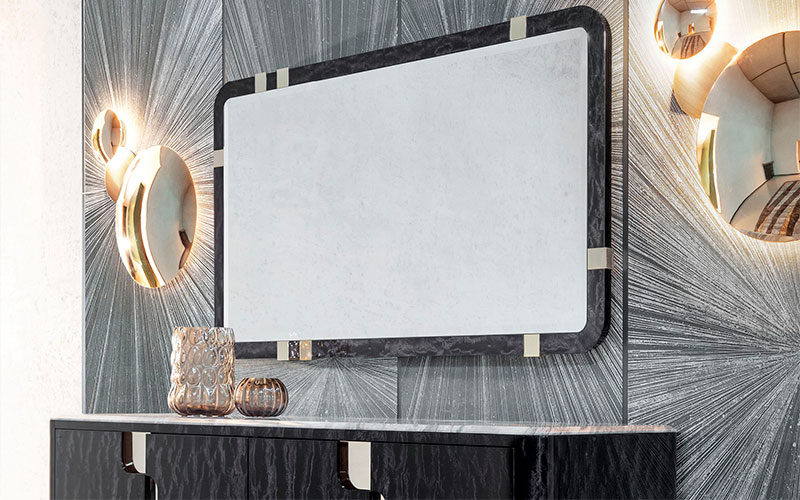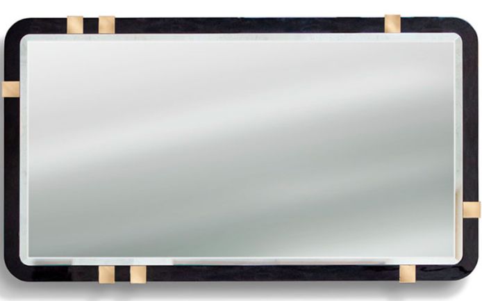Rectangular mirror with beveled glass. Frames in combination of Black Bubinga burl veneer with high gloss polyester finish and light gold chrome stainless steel.